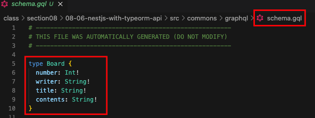 resolver 와 service 파일을 수정하였다면 아래와 같이 schema.gql 파일에서 자동으로 Board 타입 이 만들어진 것을 확인할 수 있다.