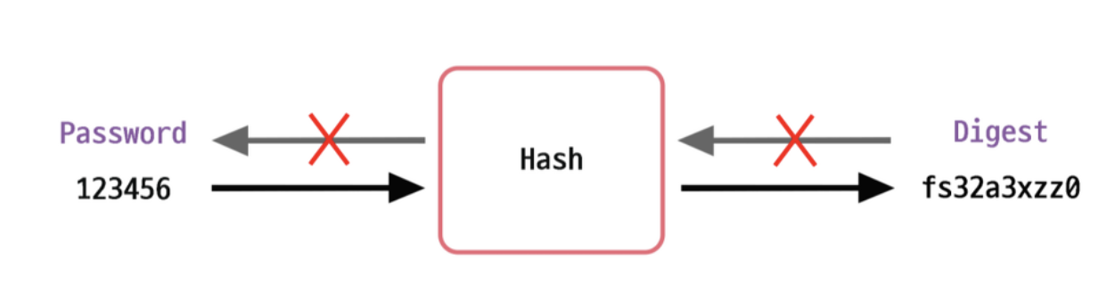 또한 앞서 말했듯 해싱은 단방향이다. 한마디로 단방향 해시 함수는 다이제스트를 복호화 한다는 것, 즉 원본 데이터를 구할 수는 없어야 한다. 말 그대로 단방향성의 특성을 갖기 때문이다.
