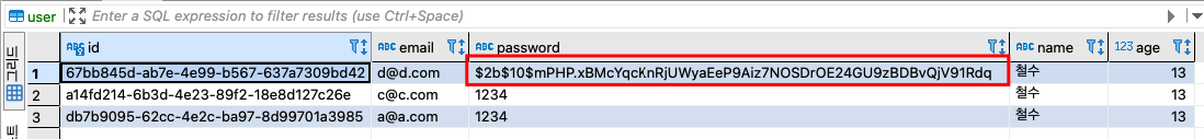 이전 시간에 생성된 유저정보와 비교했을 때 암호화된 비밀번호가 잘 적용된 것을 확인할 수 있다.