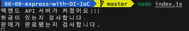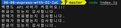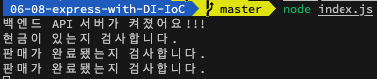 터미널의 위치가 해당 폴더가 아니라면 06-08-express-with-DI-IoC 폴더로 이동하여 node index.js 명령어를 사용하여 실행한다