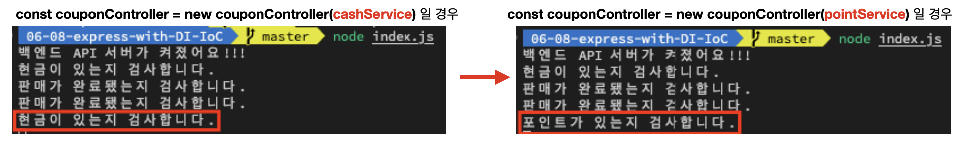이때, CouponController를 바꾸지 않고 cashService 대신 pointService를 의존성 주입시켜 주면 된다.