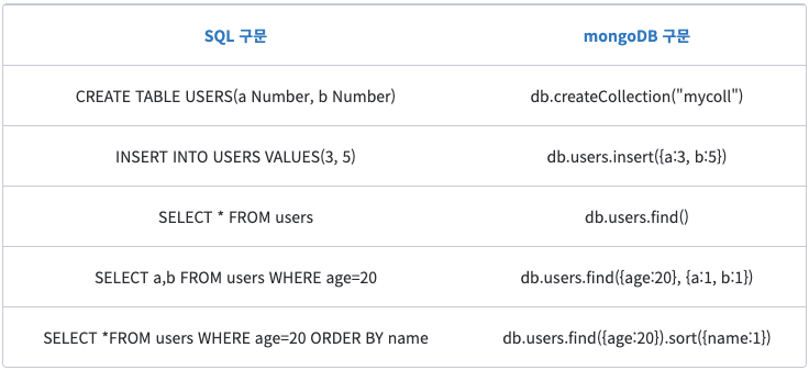 Mysql과 MongoDB 둘이 대표적으로 사용하는 용어도 다르다.