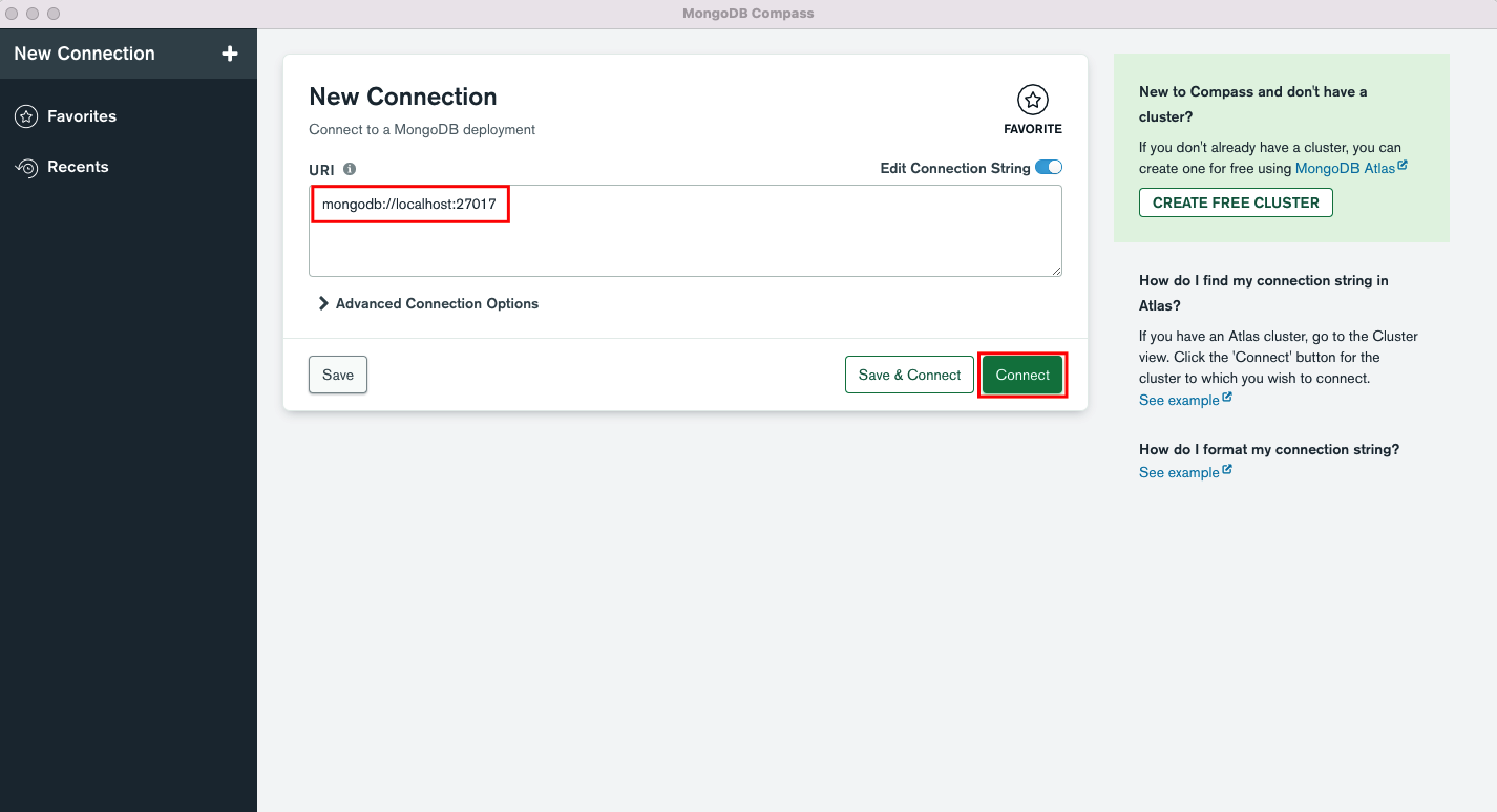 URI부분에 mongodb://localhost:27017을 입력(기본 설정값)하여 데이터베이스에 접속해 준다.