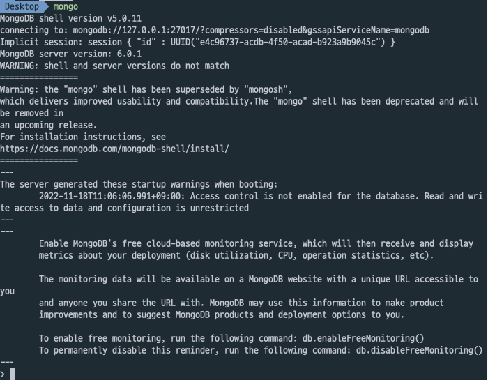 MongoDB가 켜져있다면 mongo를 입력해 mongoDB에 접속하자