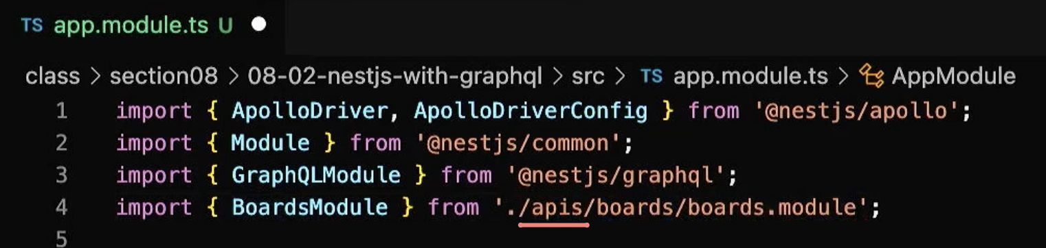 VSCode 로 돌아가셔서 08-02-nestjs-with-graphql → src 폴더로 들어가셔서 app.module.ts 파일을 아래와 같이 수정한다.