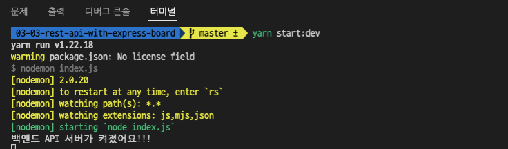터미널에서 03-03-rest-api-with-express-board 폴더 안으로 이동하고,