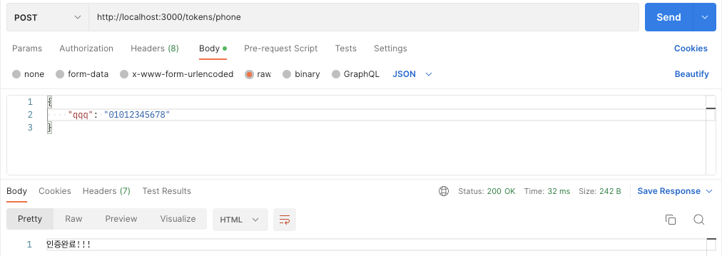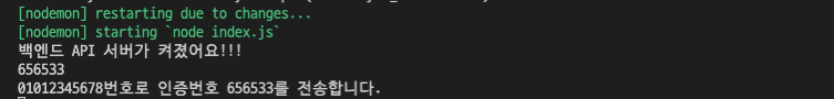 그리고 터미널을 확인해보면 핸드폰 번호도 잘 전달되었고, 토큰도 만들어진것을 확인할 수 있다.
