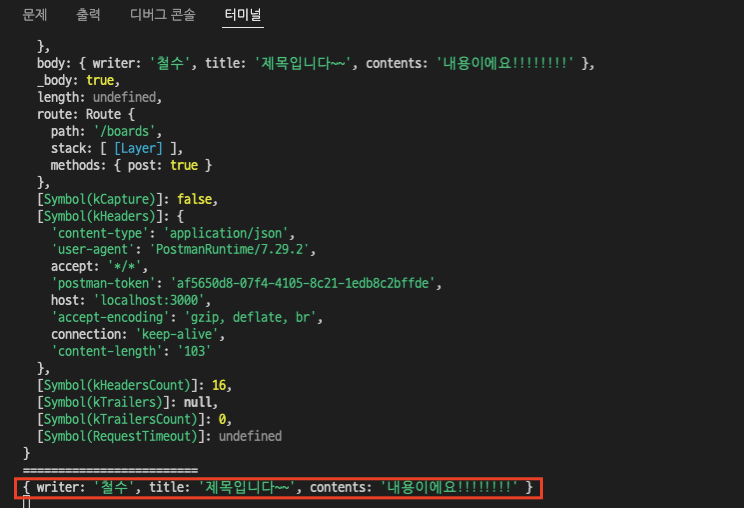 이어서 vscode 터미널에는 요청 값이 잘 들어왔는지 콘솔 출력 값을 확인해 보자