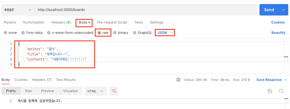 이번에는 POST 요청으로 바꾸고, postman을 이용하여 게시글 등록을 해보자