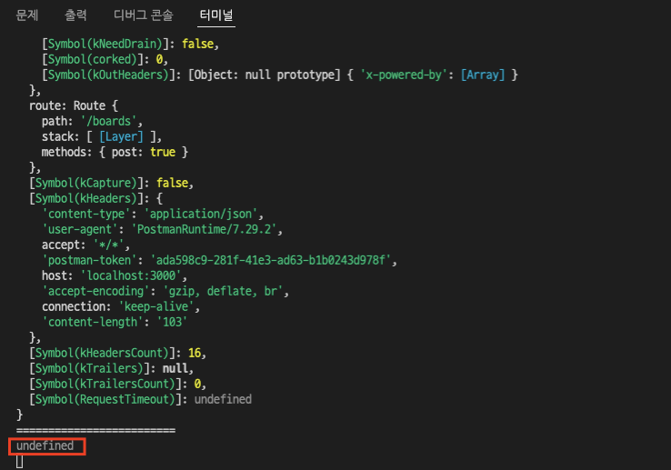 객체 형태의 req는 잘 나왔지만, req.body는 undefined가 출력되었다. 이는 왜 그럴까?