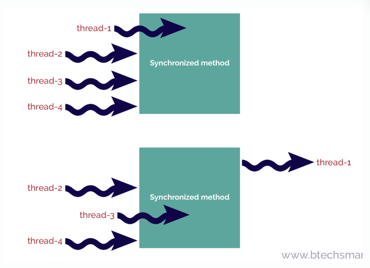 아래 그림 처럼 thread-1이 메서드에 진입하는 순간 나머지 thread-2 ~ 4의 접근을 제한하고, thread-1이 완료가 되면 다음 스레드를 접근시킨다.