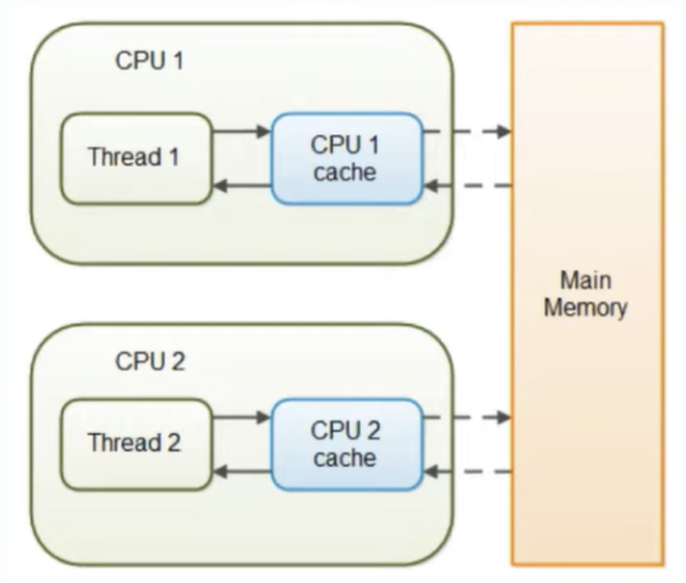 문제는 비동기로 변수값을 캐시에 저장하다가, 각 쓰레드마다 할당되어있는 캐시 메모리의 변수값이 일치하지 않을 수 있다는 점이다.