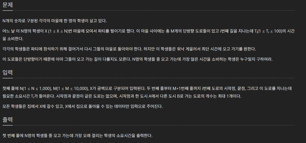 여기서 문제는 특정도시 X로 간 후 다시 자신의 위치로 돌아오는 것이 이 문제의 핵심이라 생각한다.