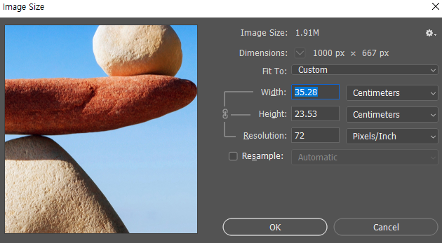 해상도가 300일경우 72로 낮춤 resample 해제 resolution 해상도 72로바꾸고 resample 체크 그렇게 하면 이미지 사이즈 변하지 않음 (이미지 사이즈를 유지하면서 해상도를 변경하는것)