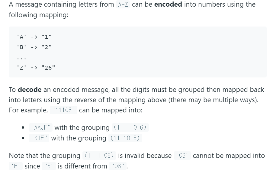 여기서 주의할 점은 "0"에 대한 처리이다. "06"은 어떤 알파벳으로도 바꿔 줄수 없으므로 답은 0이 나온다. 처음에 생각한 방식은 "11106"이 들어오면 첫 문자열 부터 순회를 하면서 dp[i] = (i까지의 총 만들 수 있는 개수)로 생각하고 시작하였다.