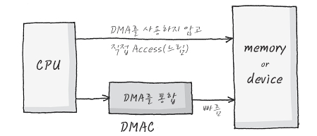 DMA는 이런 식으로 CPU와 상관없이 전송하는걸 DMA라고 부릅니다. 실제 CPU가 Control하는 건 DMAC (DMA Controller)를 Countrol 해주는 과정을 의 미힙나다.
