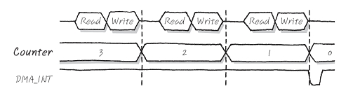 Burst Address Mode는 무작정 시작하면 끝까지 Read Write를 무한 반복 하는 거에요. 이 녀석도 마찬가지로 Counter를 1씩 줄여나가면서 0이 될 때까지 하는 거죠. 다 끝나면 마찬가지로 DMA_INT를 이용해서 CPU에게 알려주고요.