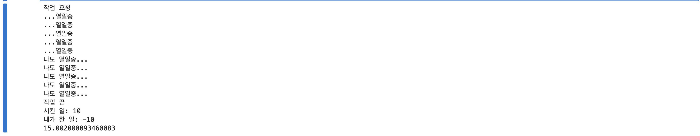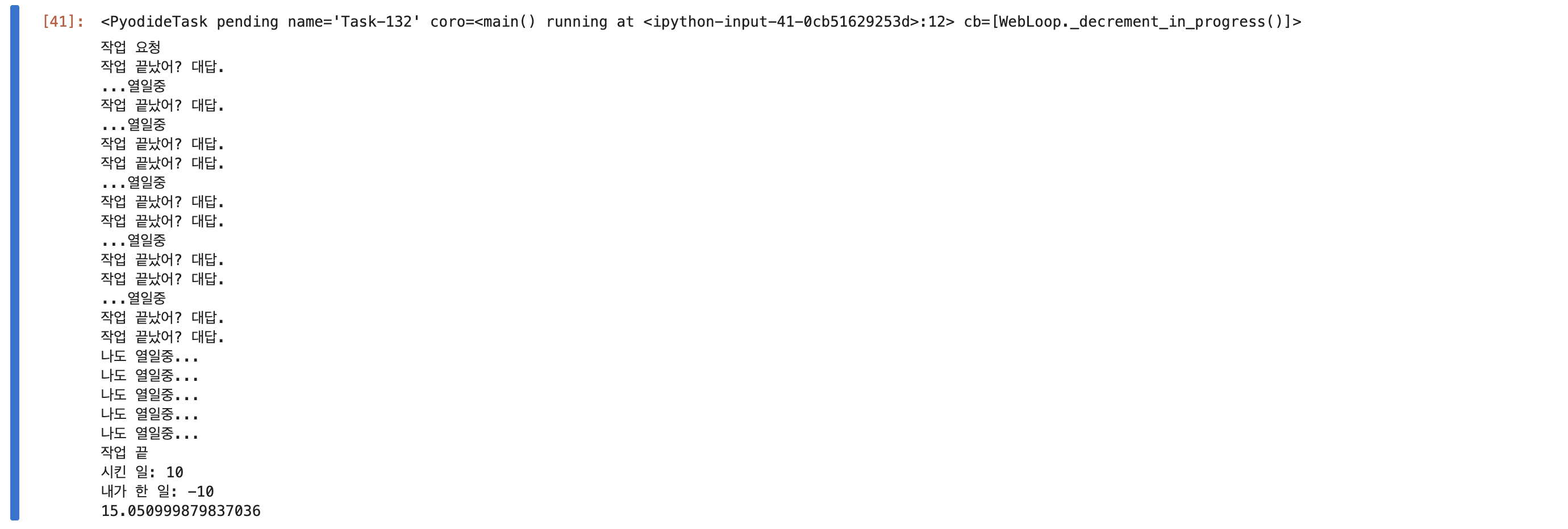 여기서 주목할 부분이 '...열일중'이라고 하기 전에 while을 타면서 main은 synchronous 상황과 달리 일을 맡기고 자기 일을 하려고 돌아온 것을 볼 수 있습니다. 하지만 제어권을 task가 가지는 바람에 main은 자기 일을 제대로 하지 못했습니다.
