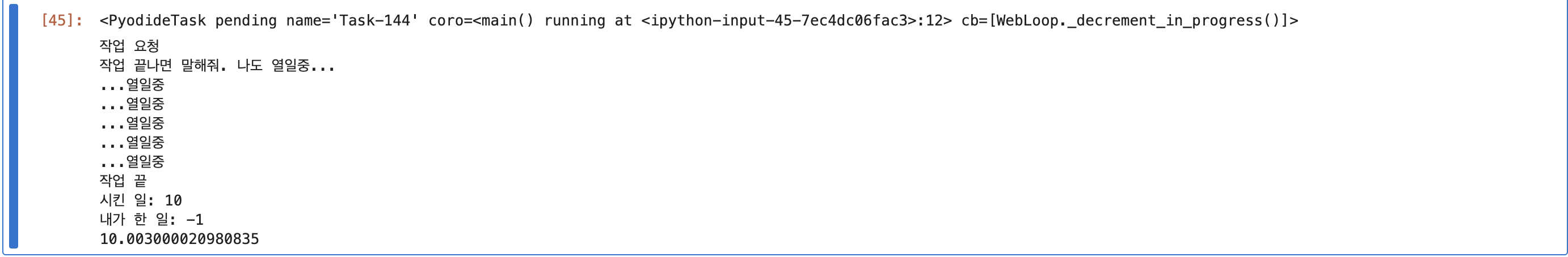 이벤트 루프를 통해 제어권이 반납될 수 있도록 하기 위해서 첫번째 예시와 달리 여기서는 aysncio.sleep을 사용하였습니다.