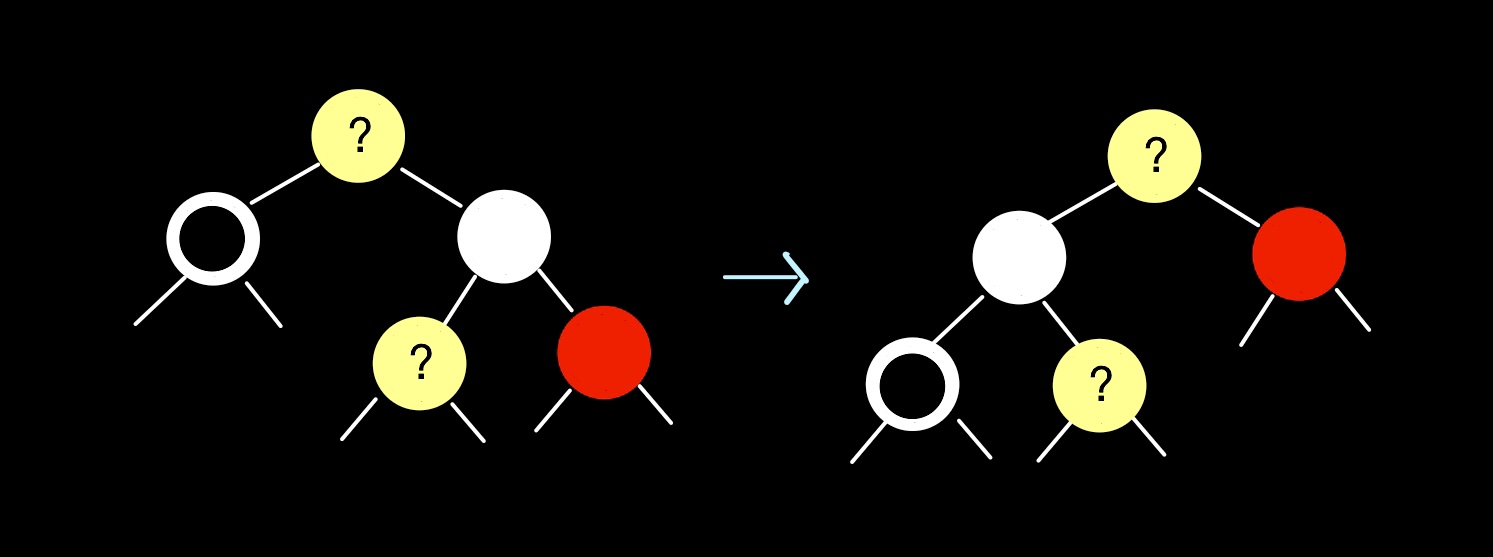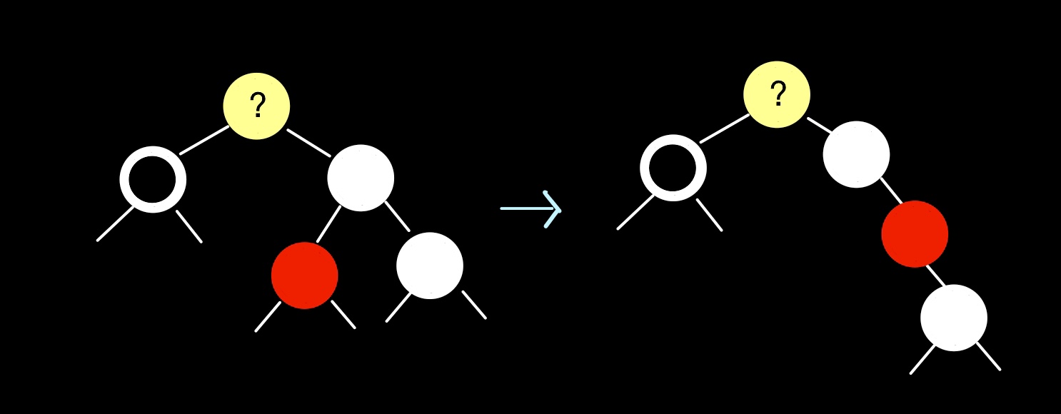 Case 4로 만들어 준다. uncle 노드를 레드로, uncle의 왼쪽 자식을 블랙으로 바꾼 뒤 right rotation을 진행한다.