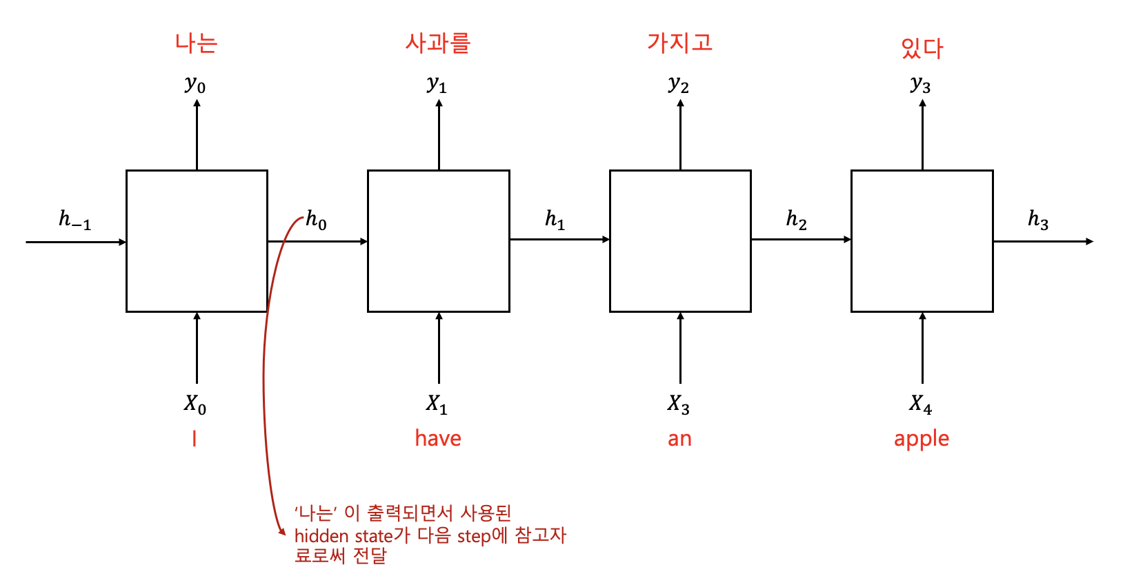 'I', 'have', 'an', 'apple' 이 각 층에 입력되면 그에 따라 '나는', '사과를', '가지고', '있다'가 출력되게 된다. '나는'이 출력되는 step을 살펴보면, 입력 'I'와 이전 step에서의 hidden state를 통해 와 (나는)이 도출되게 된다. 이때 이 step에서의 hidden state 는 다음 step에 참고자료로써 전달되게 된다.