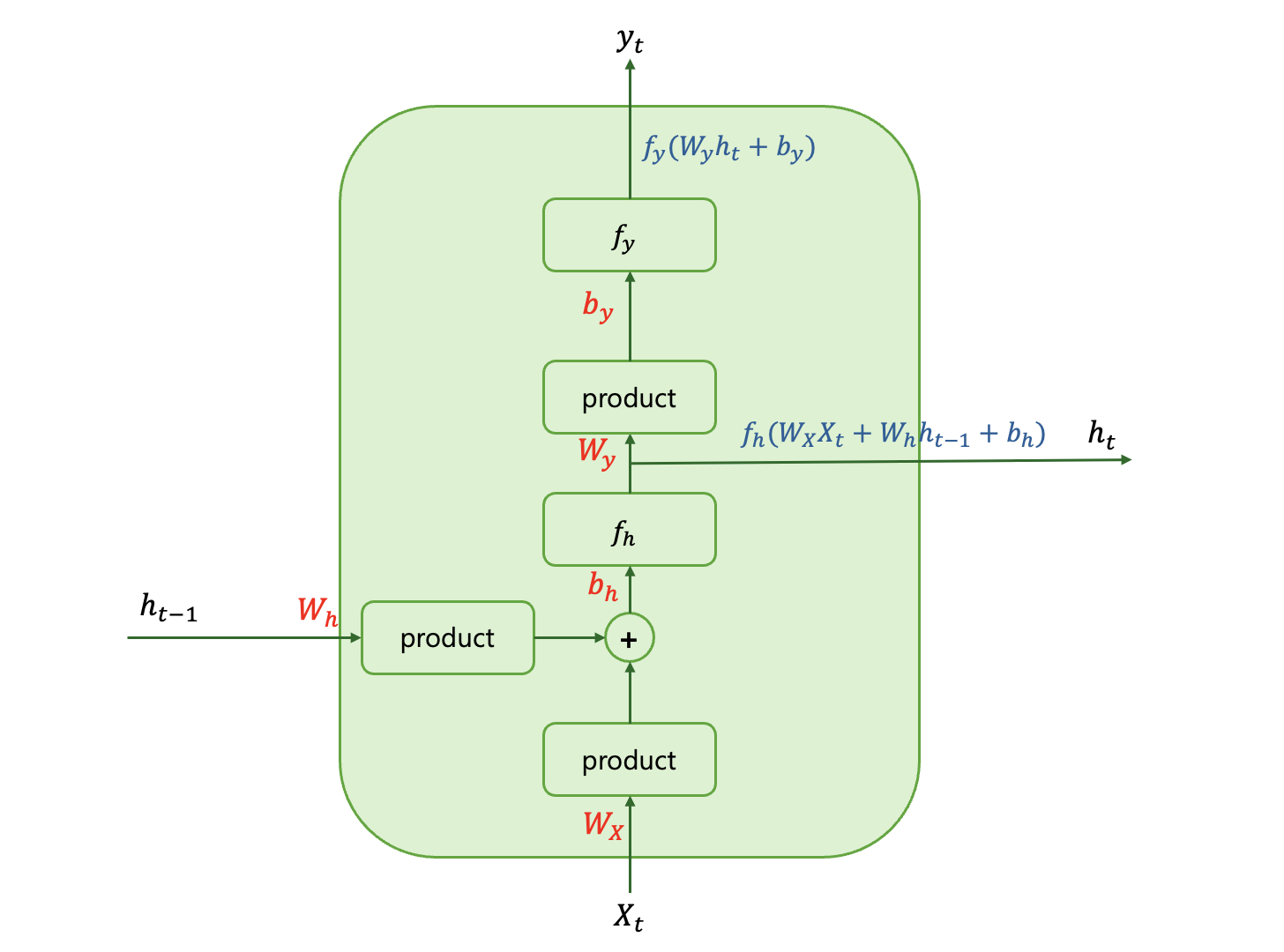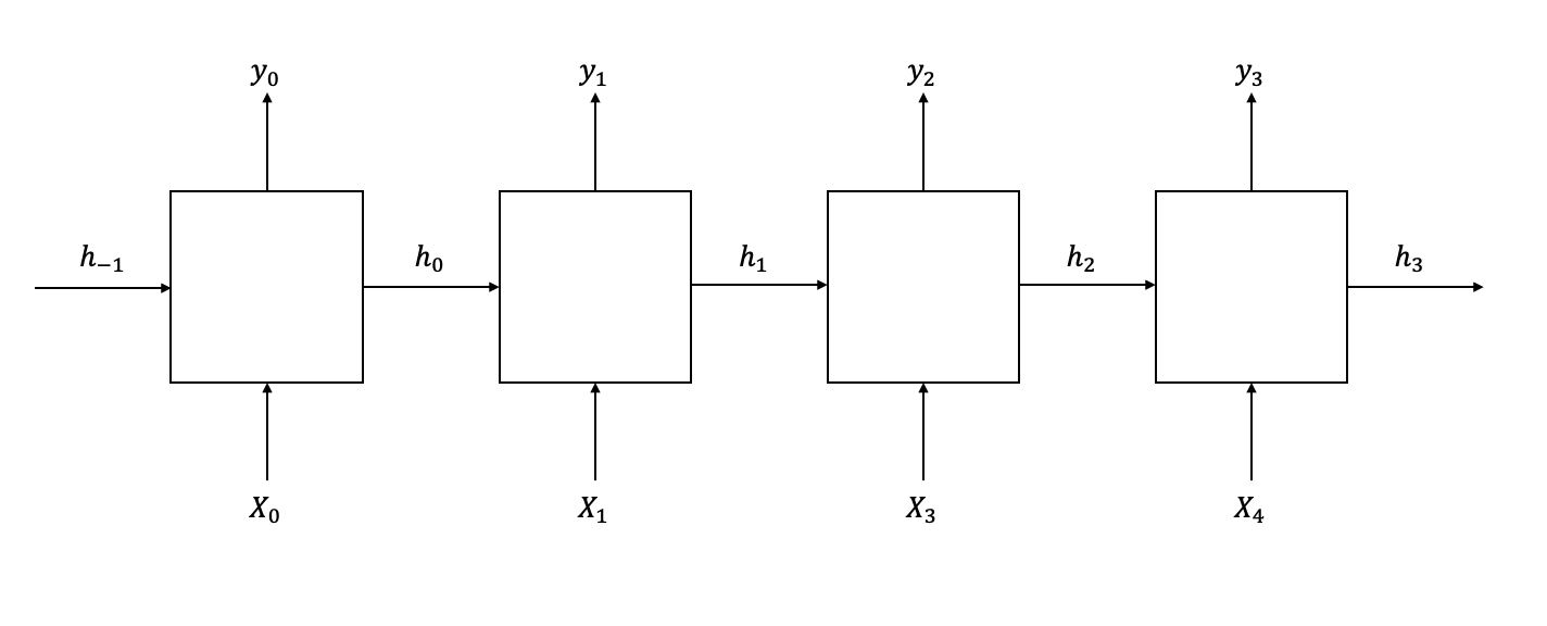 RNN의 가장 기본적인 구조는 위와 같다. 입력 값 가 RNN의 각 층에 입력이 되고, 어떠한 층의 입력 값과 이전 층의 hidden state를 통해 해당 층의 hidden state가 도출되고, 이 hidden state로 부터 연산과정을 거쳐 해당 층의 출력 값 가 출력되게 된다.