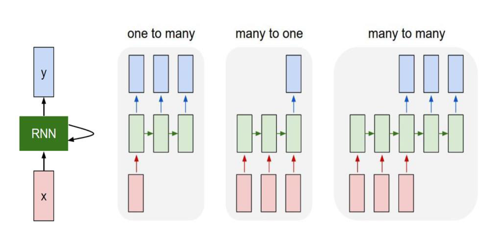 one to many 구조는 사진에 설명을 추가하는 task, many to one 구조는 문장의 감정 분석 task, many to many 구조는 번역 task 등에 사용된다.