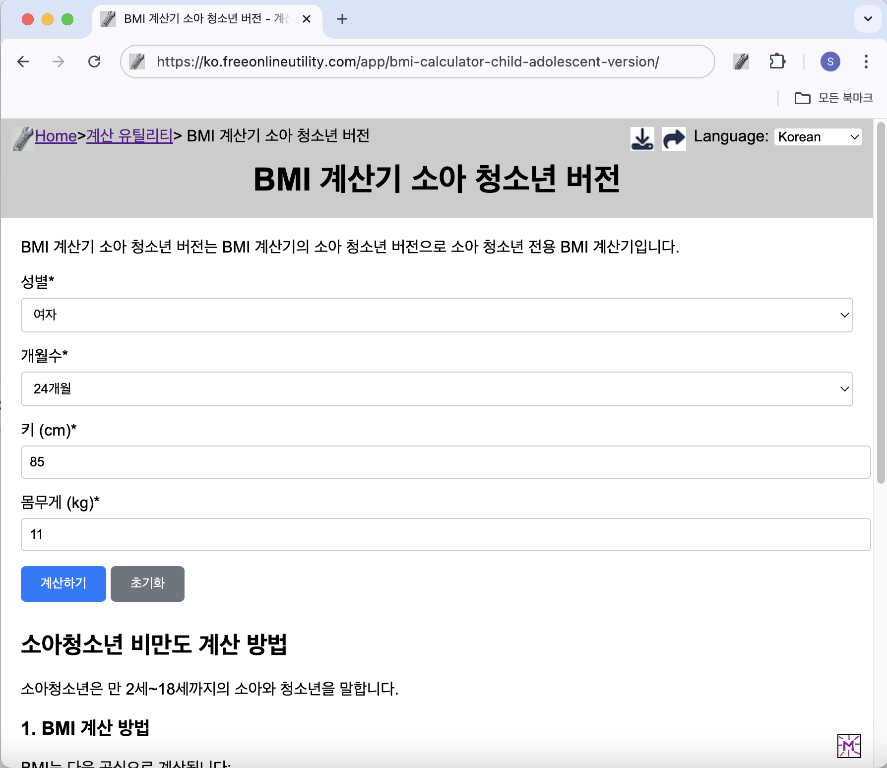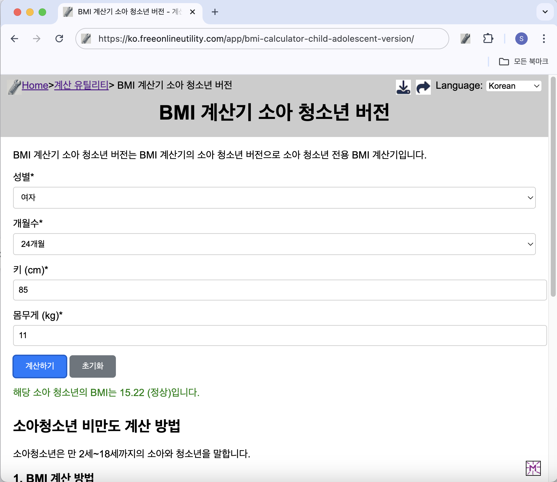 소아청소년 BMI 계산기는 만 2세부터 18세까지의 소아와 청소년을 위한 전문 체질량지수(BMI) 계산 도구입니다. 간단한 정보 입력만으로 자녀의 건강 상태를 빠르게 확인할 수 있으며, 별도의 앱 설치 없이 웹 브라우저에서 바로 이용 가능합니다.