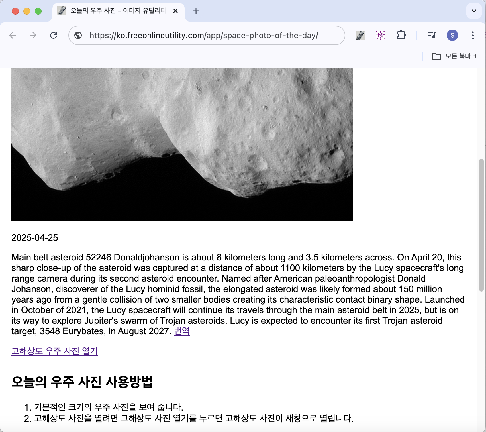 - 페이지에 접속하면 최신 우주 사진과 함께 날짜, 제목, 설명이 자동으로 표시됩니다.