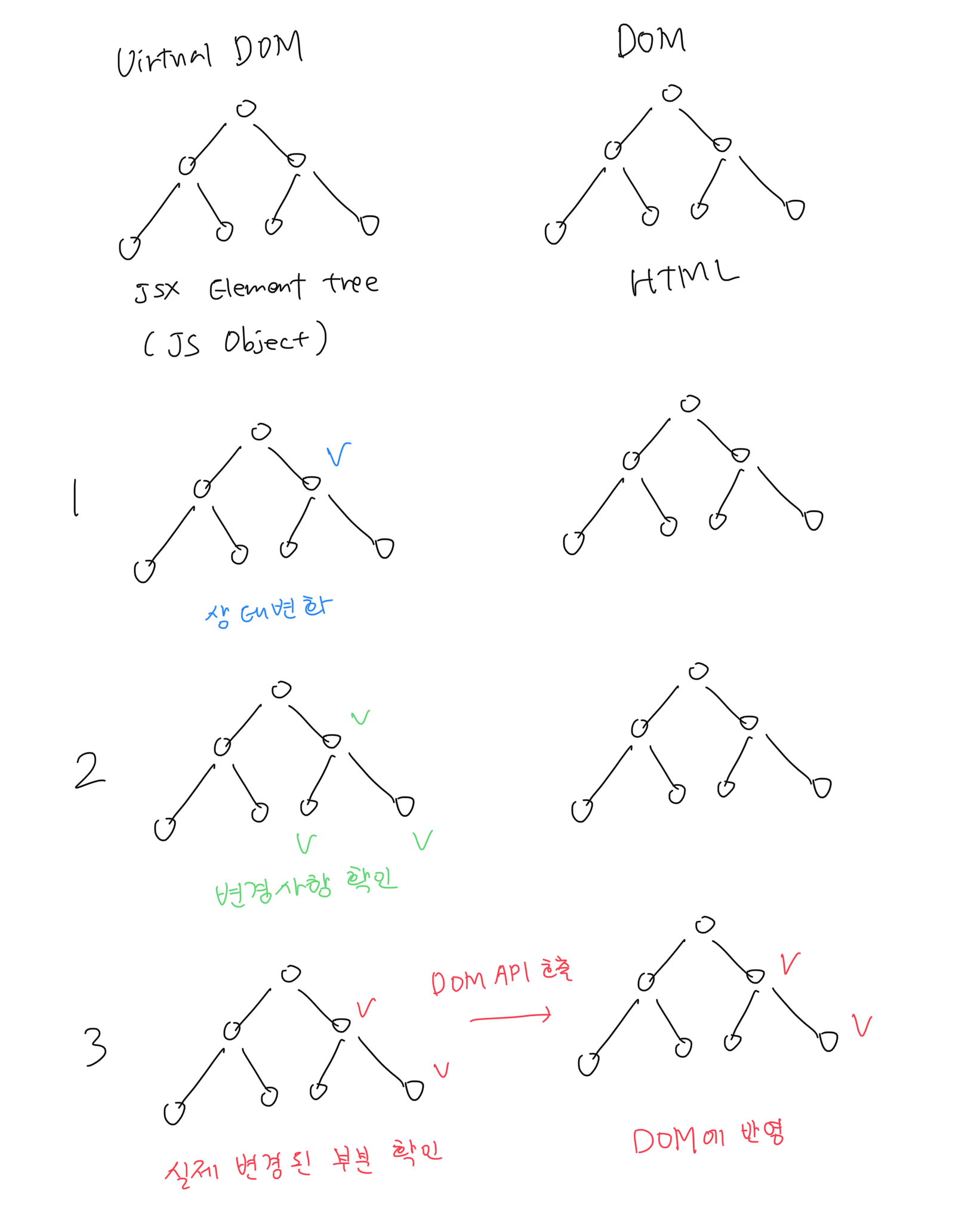 Virtual DOM은 하나의 가상 레이어입니다. Virtual DOM에 적용하는 변경사항은 DOM에 바로 반영되지 않습니다. 변경사항들을 모두 모아뒀다가 한 번에 DOM으로 보냅니다. 그러면 DOM은 딱 한 번만 UPDATE를 하면 되고, 그러면 render도 한 번만 해주면 되는 겁니다.