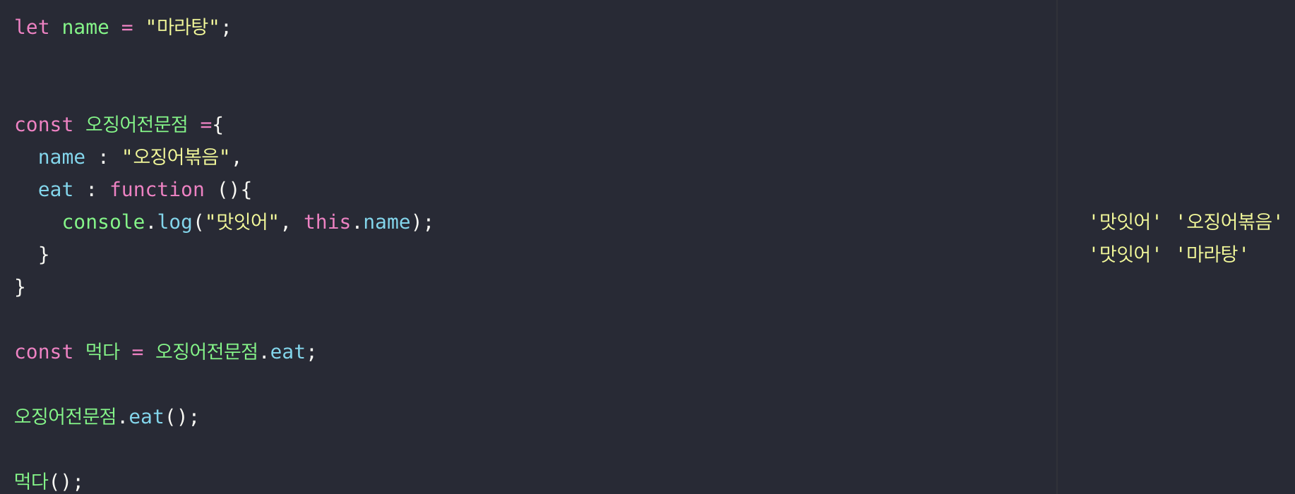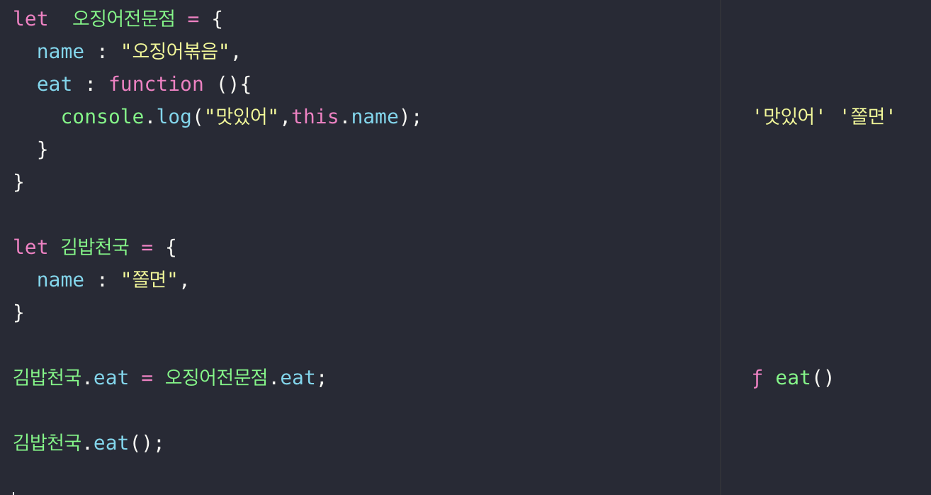먹다 라는 변수에 오징어전문점의 함수인 eat 메소드를 할당하였다.