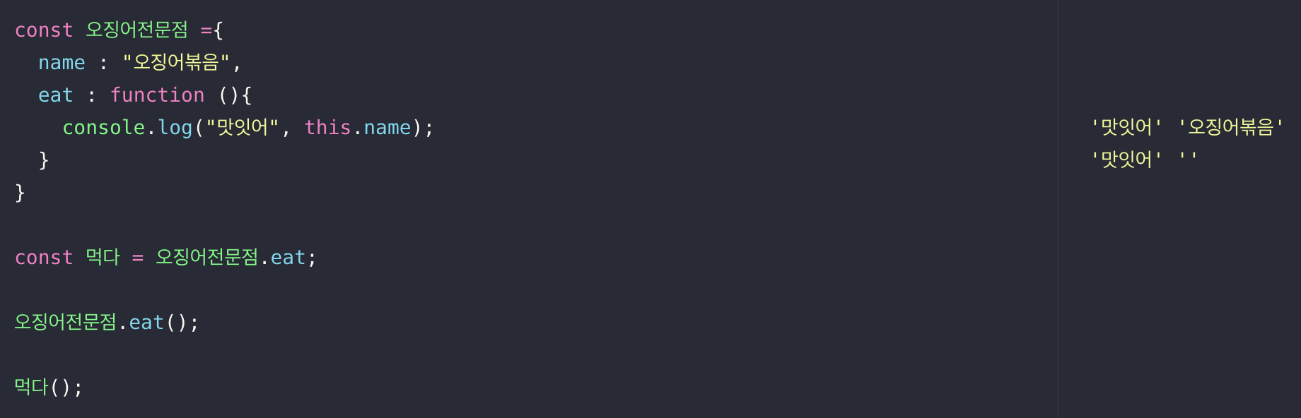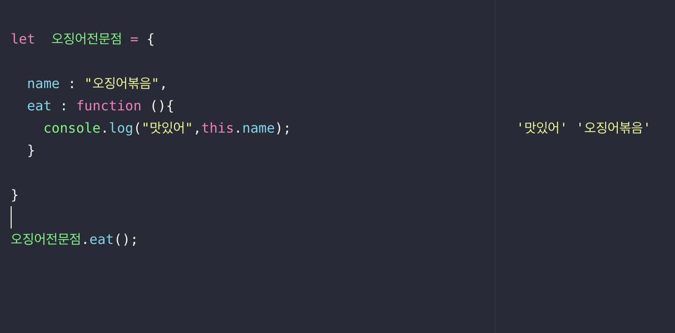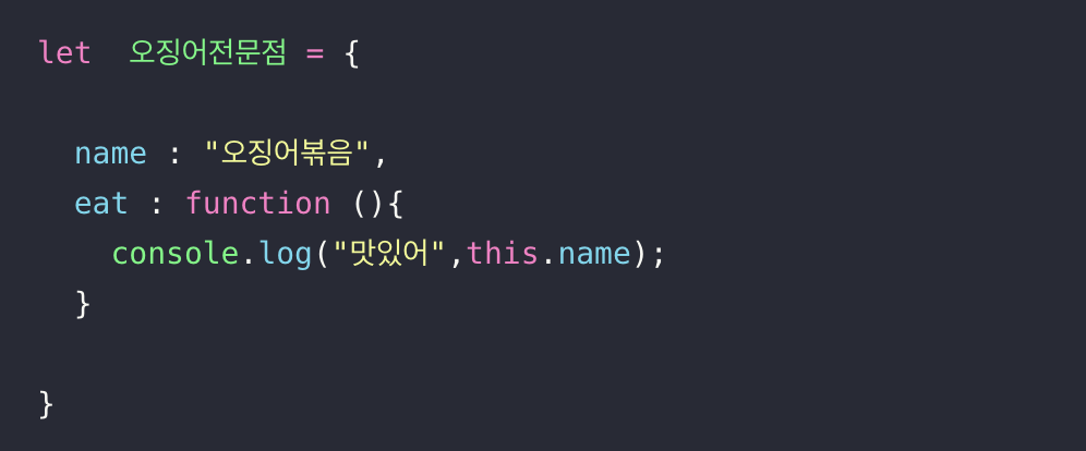 오징어전문점이라는 변수에 eat 이라는 프로퍼티가 있고 함수가 할당되어 있다.