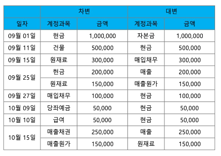 그래서 거래를 분개하면 거래의 이중성에 따라 차변금액과 대변금액은 반드시 일치하게 된다.