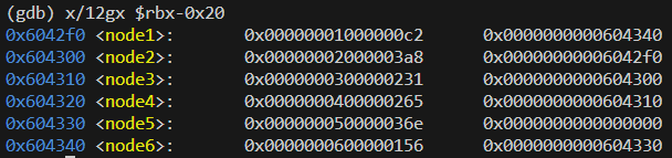 node+0x8 부분이 변화한 것을 알 수 있다. node+0x8 이 의미하는 것이 다음 노드의 주소이다. <+181> 쪽에서 반복문을 수행하면서 node+0x8 부분을 입력값에 맞게 변화시킨 것이다.