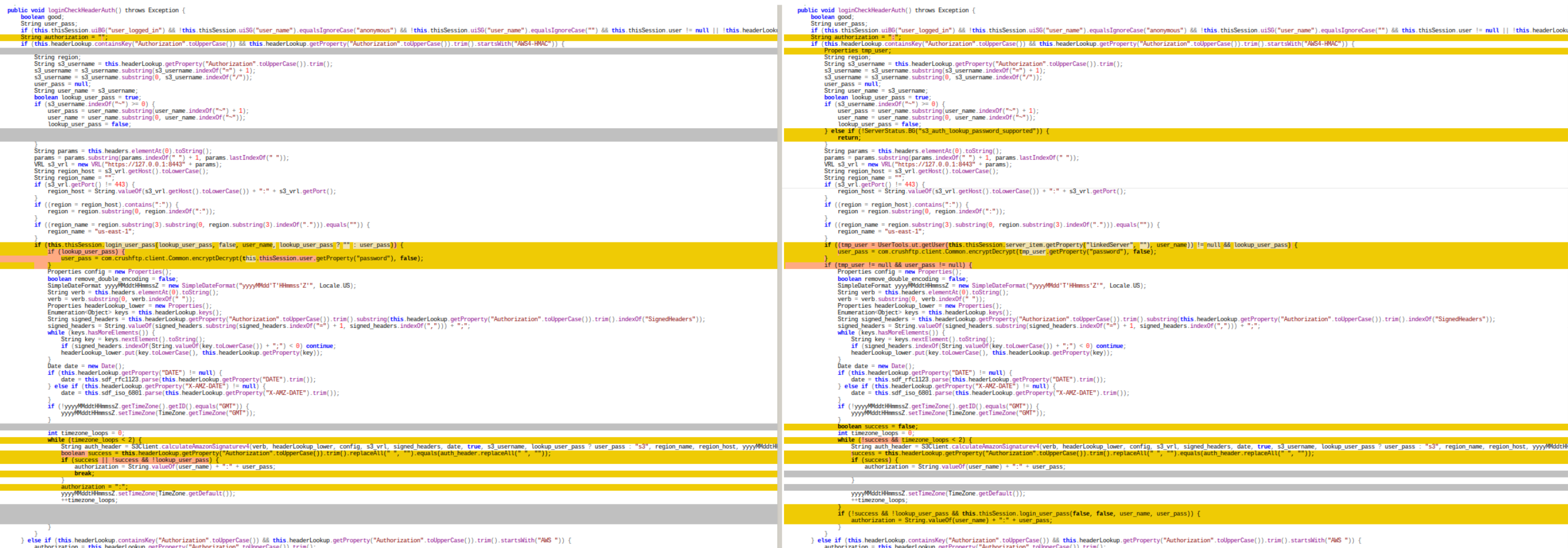 CrushFTP의 특정 버전에서 S3 인증 헤더 처리와 관련된 취약점입니다. 알려진 사용자명을 이용해 인증되지 않은 공격자가 해당 사용자처럼 수행할 수 있습니다. 이 취약점으로 관리자 권한으로 작업을 수행하거나 데이터에 접근할 수 있습니다.