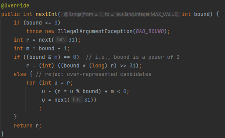 따라서 bound = 2^n 일 때 nextInt(bound)는 0 ~ 2^n-1 이 반환된다.