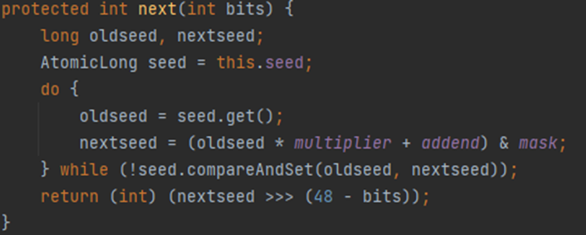 반환값은 nextseed의 상위 bits비트만 취한 int형임을 알 수 있다.