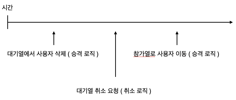 승격 로직이 대기열에서 사용자를 삭제한 직후 아직 참가열에 추가하기 전, 거의 동시에 취소 로직이 실행되어 참가열에서 해당 사용자를 취소하면 사용자가 존재하지 않기 때문에 취소 로직에서 오류가 발생하게 됩니다.