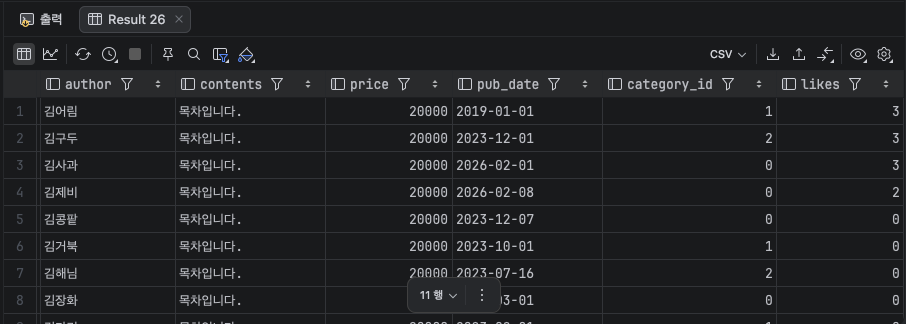 변경점은 서브쿼리를 포함한 sql로 변경했다는 점이에요. 응답도 잘 돌아왔어요.