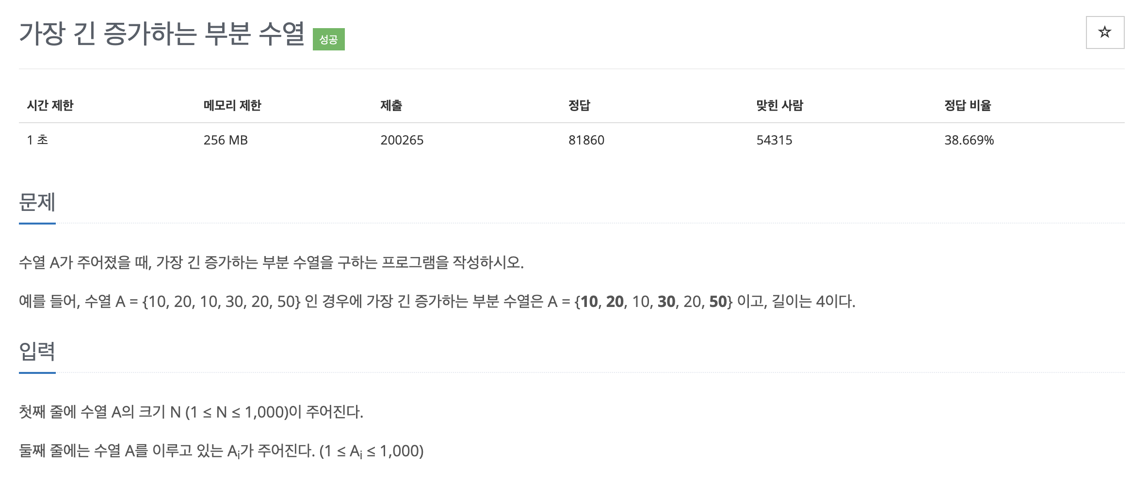 해당 수열이 증가하는 부분의 길이를 구해야 하며, 정답 수열에 포함되는 숫자들이 연속하지 않을 수도 있다.