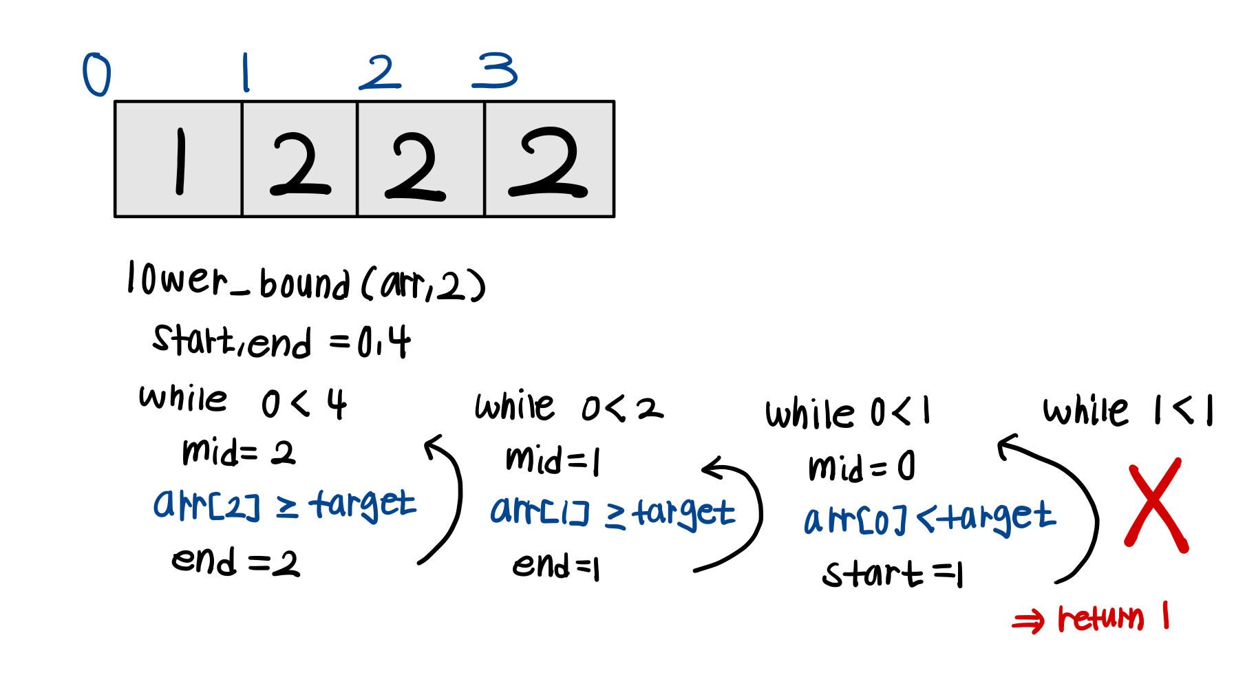 ๊ธฐ์กด์ ํน์ ๊ฐ์ ์ฐพ๋ ์ด๋ถํ์๊ณผ ๋ฌ๋ฆฌ end ์ง์ ์ len(arr)์ด ๋์ด์ผ ํจ