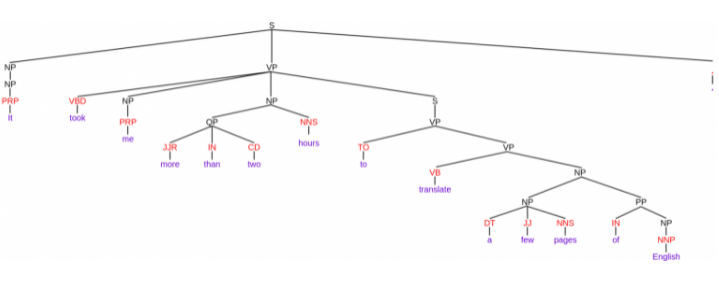 보라색: 문장에 쓰여진 단어, 빨간색: POS tag, 검은색: constituent(구성 성분)
