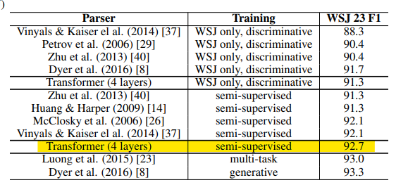 - Transformer가 다른 작업에서도 일반화할 수 있는지 평가하기 위해 영어 constituency parsing 실험하였다