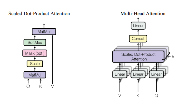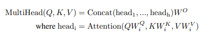 1) 쿼리, 키, 벨류를 각각 dK, dk, dv 차원으로 변환하는 서로 다른 h개의 학습 가능한 linear projection