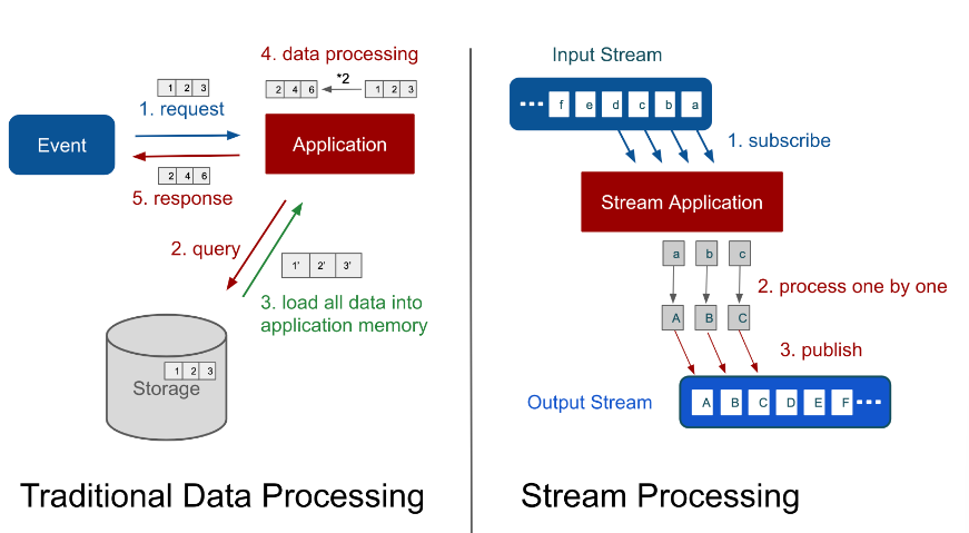 전통적인 데이터 처리 방식은 데이터 처리 요청이 오면 페이로드(payload)전송되는데이터 를 모두 애플리케이션의 메모리에 저장한 다음 처리를 해야 한다. 추가되는 데이터도 모두 DB에서 조회하여 메모리에 적재해야 한다. 이 방식의 문제점은 1. 필요한 데이터의 크기가 메모리 용량보다 클 때 발생하는 out of memory ERROR 2. 순간적으로 많은 요청이 몰리면 발생하는 다량의 GC(Garbage Collection)으로 인한 서버의 응답 오류 발생이다.