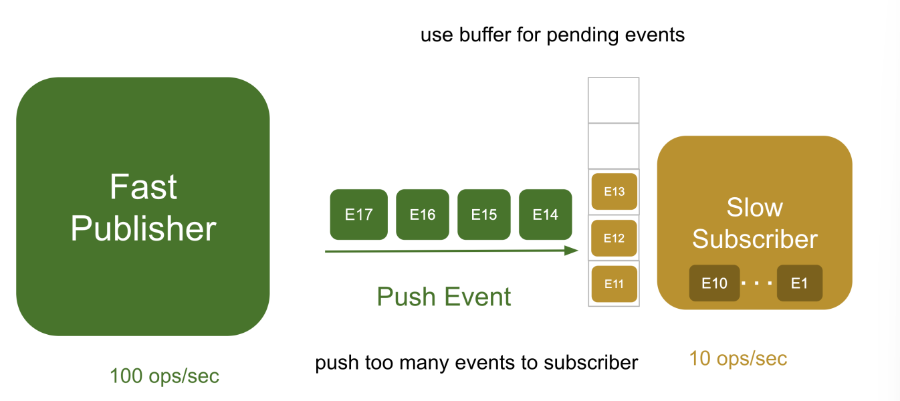 - 옵저버 패턴(observer pattern)에서는 푸쉬 방식으로 데이터가 전송되었다. 즉 publisher가 subscriber에게 밀어 넣는 방식으로 데이터가 전달되고 이 과정에서 subscriber의 상태는 고려되지 않았다. subscriber에 제때 처리하지 못하는 이벤트는 큐(queue)에 저장되었다.