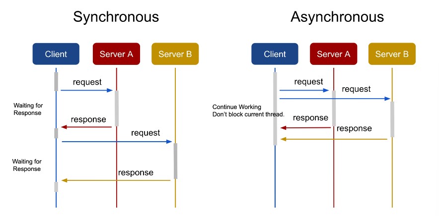 - 동기 방식은 클라이언트가 서버에 요청을 보내면 응답을 받기 전까지 블로킹(blocking)이 된다. 따라서 A에 요청을 보내면 응답이 온 후에야 B에 요청을 보낼 수 있다.