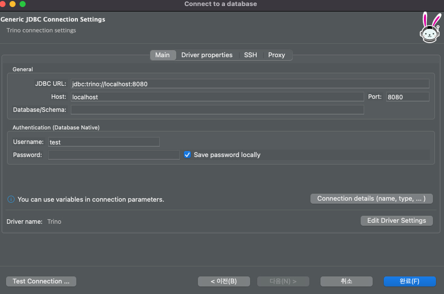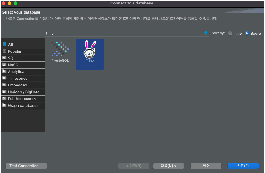 새로운 커넥션을 추가 할 때 trino 로 검색하고 다음을 누른다.