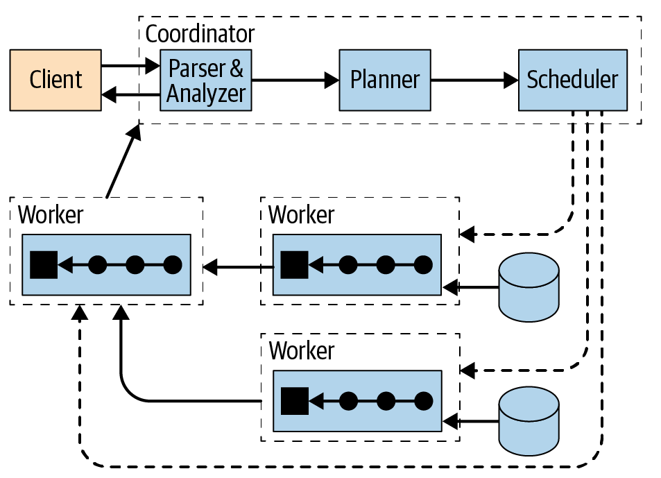 - Worker가 데이터를 처리할 때 결과는 Coordinator에 의해 검색되고 출력 버퍼의 Client에 노출