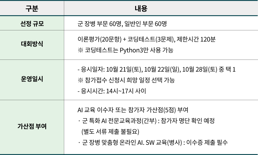 할 것도 딱히 없어 전역만을 기다리던 2023년 9월 말, 국방 AI 경진대회가 열린다는 소식을 듣게 되었다. AI에 관심은 있었지만 이렇다할 경험은 없었던지라, 좋은 기회라 생각하여 지원했다.